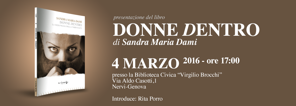Presentazione DONNE DENTRO Pubblicato il 1 Marzo 201613 Aprile 2016 da Redazione 4 MARZO ore 17,00 Presentazione del libro DONNE DENTRO – LA MERAVIGLIA DELLA NORMALITÀ di Sandra Maria Dami Share on Facebook Share Share on TwitterTweet Share on Pinterest Share Share on LinkedIn Share Share on Digg Share