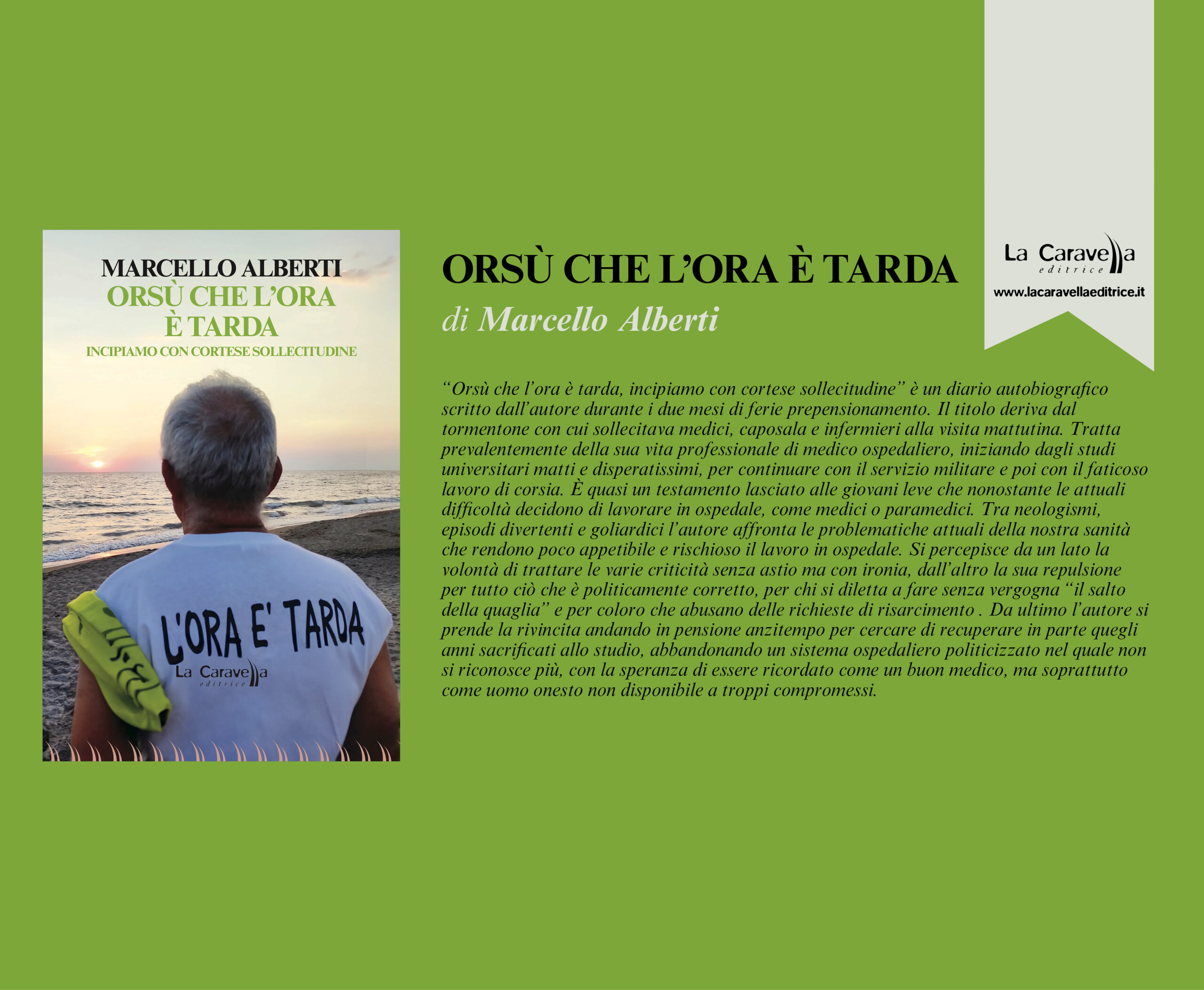 “Orsù che l’ora è tarda, incipiamo con cortese sollecitudine” è un diario autobiografico scritto dall’autore durante i due mesi di ferie prepensionamento. Il titolo deriva dal tormentone con cui sollecitava medici, caposala e infermieri alla visita mattutina.